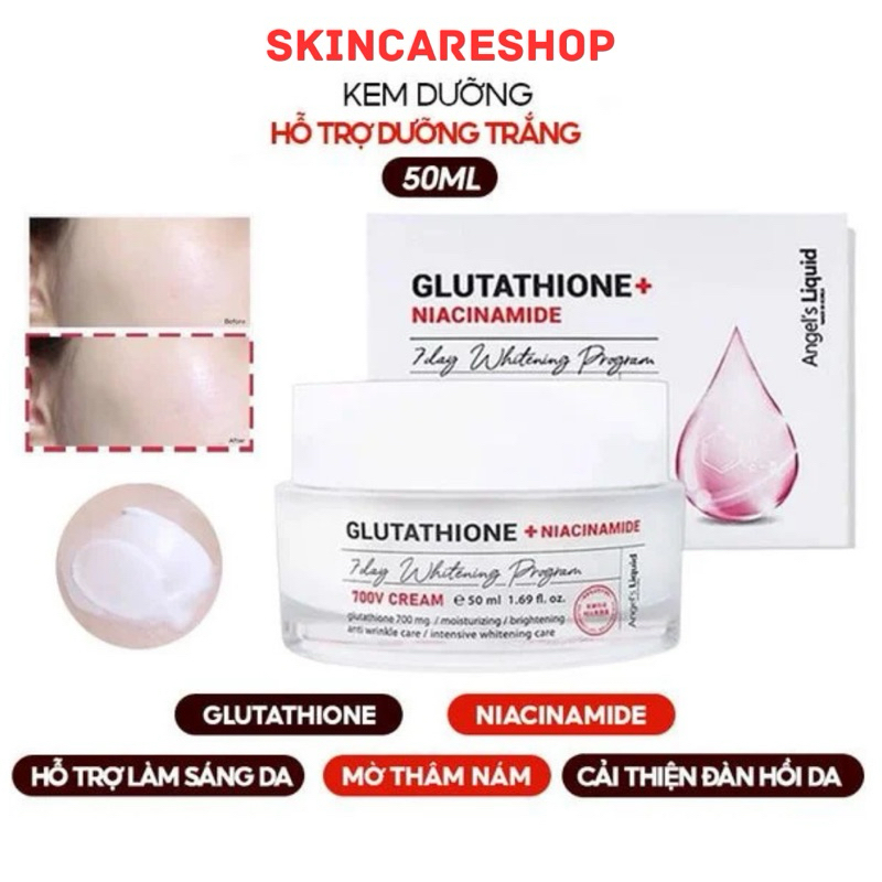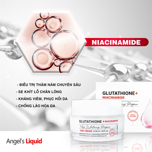 - Kem Dưỡng Đặc Trị Nám Truyền Trắng Angel's Liquid Glutathione + Niacinamide 7Day Whitening Program 700 V-Cream là dòng kem dưỡng trị nám thế hệ mới được bổ sung thêm công nghệ Niacinamide có tác dụng điều trị nám từ sâu bên trong, dưỡng trắng và se khít lỗ chân lông. Ngoài ra còn chứa các thành phần tự nhiên giúp cấp ẩm dưỡng trắng hiệu quả