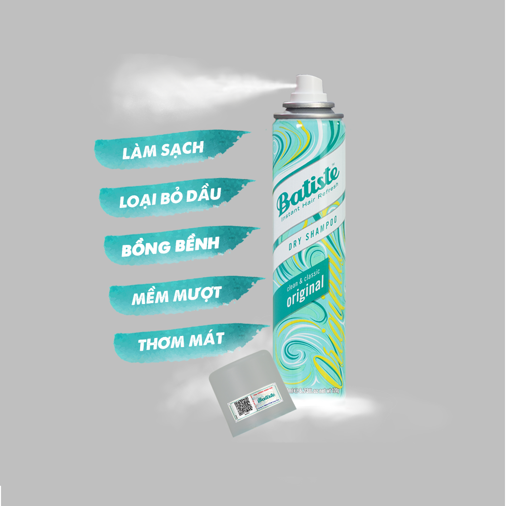 Dầu gội khô Batiste Dry Shampoo Clean&Classic Original 200ml giúp làm sạch tóc và da đầu một cách nhanh chóng mà không cần dùng nước, mang lại mái tóc bồng bềnh, đầy sức sống với hương thơm cổ điển cuốn hút, dễ chịu.