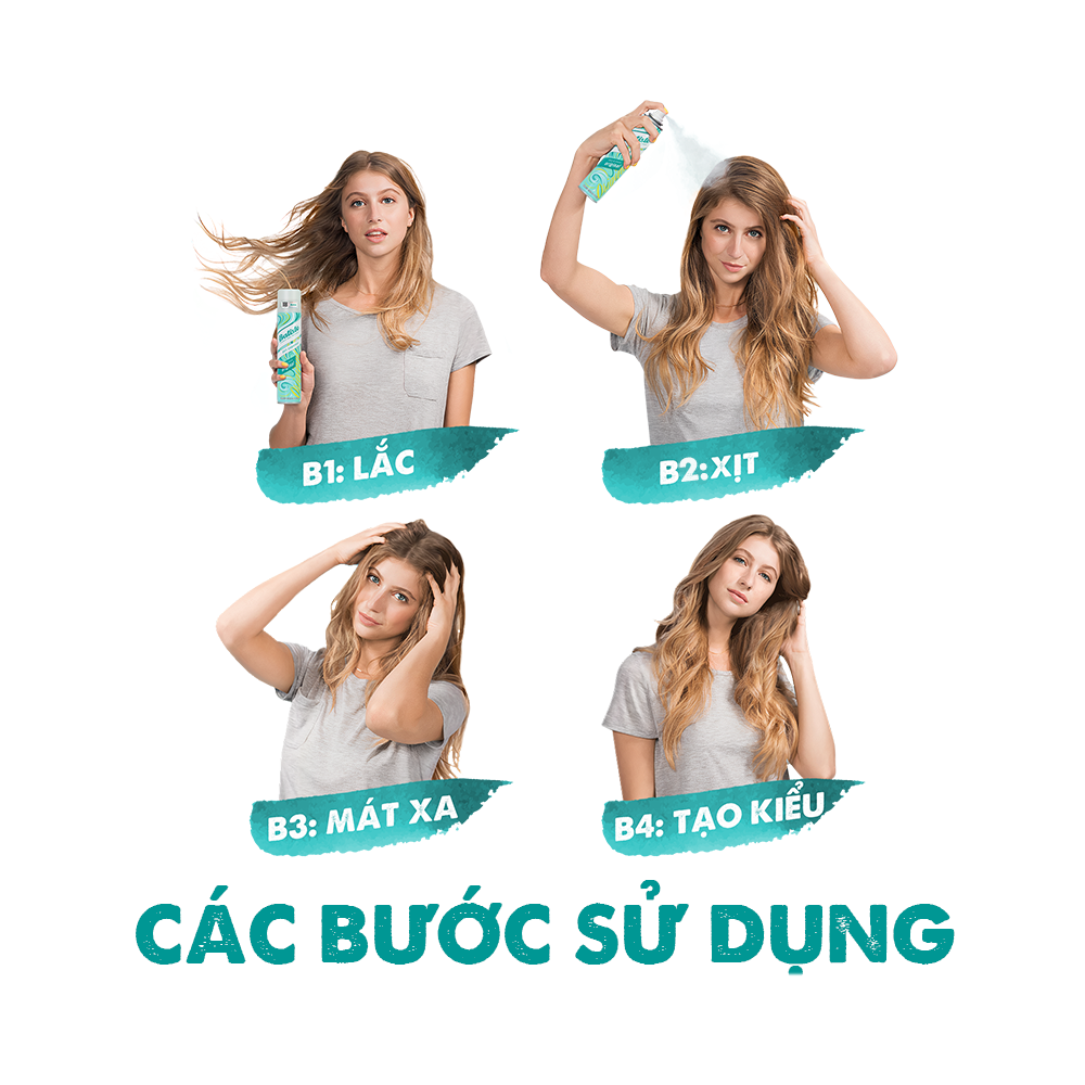 Bước 2: XỊT: Tách tóc thành những lớp tóc có độ dày vừa phải để bạn có thể xịt Batiste vào mọi ngóc ngách của lớp chân tóc. Trước khi xịt, tạo khoảng cách giữa bạn và bình xịt bằng cách cầm bình cách xa chân tóc 20 - 30cm.