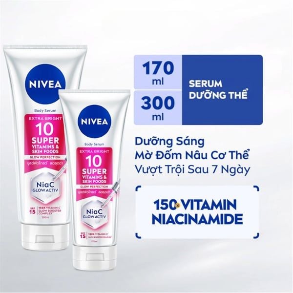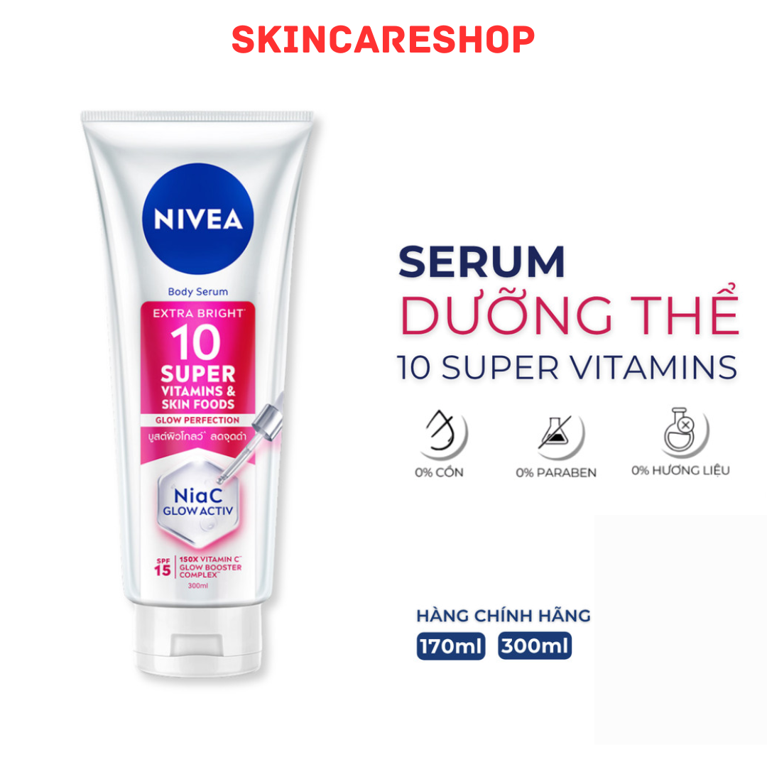 - Tinh Chất Dưỡng Thể Nivea Sáng Da Body Serum Extra Bright 10 Super Vitamin & Skin Foods Glow Perfection SPF15 170ml với kết cấu mỏng nhẹ, thấm sâu.
