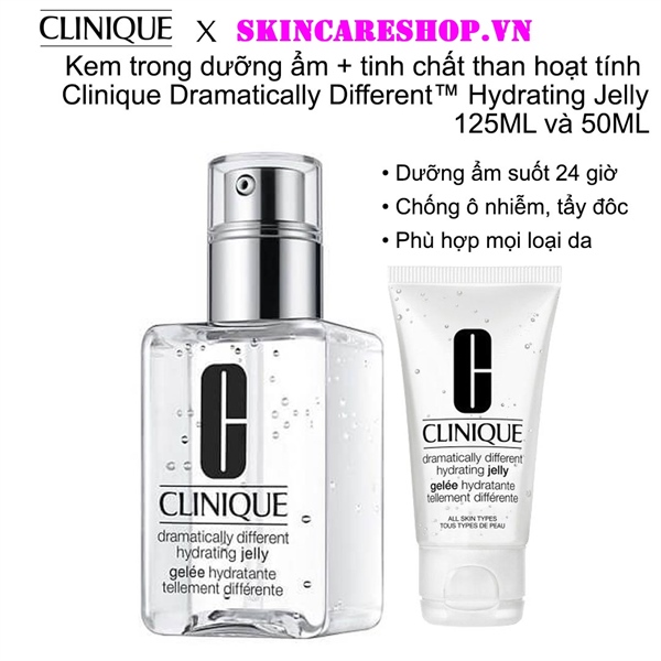Dưỡng ẩm Clinique Dramatically Different Hydrating Jelly là sản phẩm kem dưỡng ẩm với kết cấu mới lạ, dạng thạch nước rất dịu nhẹ trên da, thẩm thấu sâu và phù hợp với mọi loại da. Sản phẩm sử dụng công nghệ Màng chắn - Clean Shield Techonology™ giúp duy trì độ ẩm cho da suốt 24 giờ, đồng thời bảo vệ da khỏi yếu tố ô nhiễm môi trường. Đây là bước thứ 3 trong bộ chăm sóc da 3 bước của Clinique.
