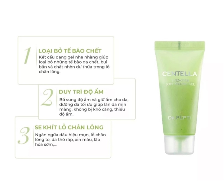 Sản phẩm Dr.Pepti Centella Turnover Soft Peeling Gel được thiết kế đặc biệt cho làn da nhạy cảm, dễ kích ứng. Với bảng thành phần lành tính gồm chiết xuất rau má, AHA, PHA và LHA, sản phẩm giúp loại bỏ tế bào sừng, làm sạch sâu mà không gây tổn thương hàng rào bảo vệ da.