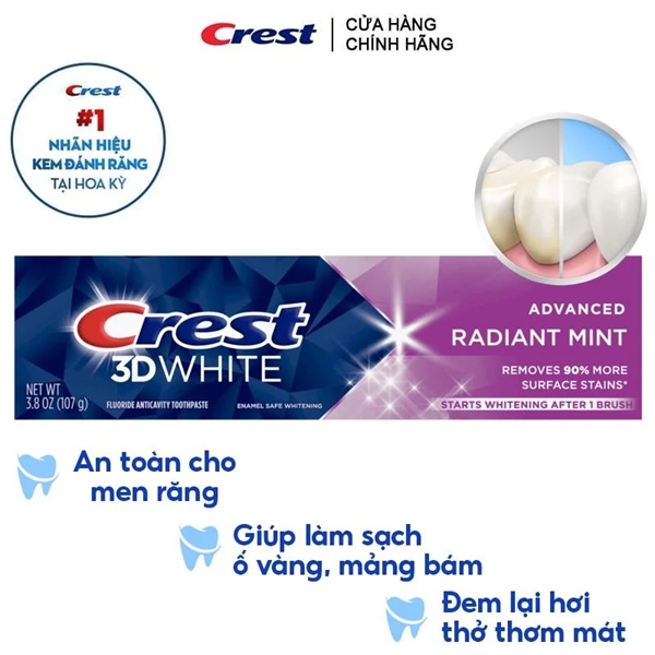 Kem Đánh Răng Làm Trắng Răng, Sạch Mảng Bám Crest 3D White Advanced Radiant Mint với những đặc trưng nổi bật sau: