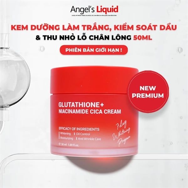 Kem Dưỡng Trắng Angel’s Liquid Glutathione Plus Niacinamide Cica Kiểm Soát Dầu, Thu Nhỏ Lỗ Chân Lông Phiên bản nâng cấp đặc biệt bổ sung hàm lượng Niacinamide 2000mg và Cica với khả năng kiềm dầu, dưỡng trắng và thu nhỏ lỗ chân lông, cải thiện thâm sạm, tàn nhang và hỗ trợ làm mờ các vết thâm mụn.