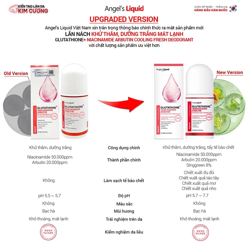 Siêu phẩm lăn nách khử thâm dưỡng trắng của nhà Angel's Liquid đã chính thức trở lại với phiên bản mới nâng cấp vẫn sở hữu công thức khử thâm, dưỡng trắng mạnh mẽ từ 5% Niacinamide + 2% Arbutin + Glutathione, nay còn được bổ sung thêm hoạt chất chống oxy hoá, tẩy tế bào chết hoá học "thế hệ mới" độc quyền - Singgreens từ phức hợp các chiết xuất tự nhiên an toàn, lành tính đã được nghiên cứu. Giúp tăng X8 lần hiệu quả khử thâm, dưỡng trắng thông qua cơ chế làm sạch các tế bào chết/ hắc sắc tố trên bề mặt da để da thông thoáng, mịn màng, dễ hấp thụ dưỡng chất, đồng thời, ức chế sản sinh hắc sắc tố và ngăn chặn sắc tố di chuyển lên trên bề mặt da từ sâu bên trong. Từ đó, mang đến kết quả xử lý thâm sần rõ rệt của các vùng da trên cơ thể như: vùng nách, khuỷu tay, đầu gối,... cho làn da mịn màng, đều màu và trắng sáng rạng rỡ hơn.