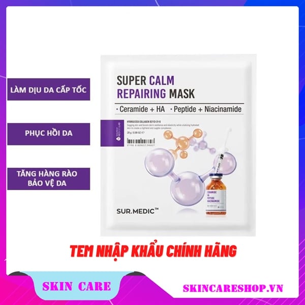 Mặt Nạ Phục Hồi, Làm Dịu Da Cấp Tốc Sur.Medic+ Super Calm Repairing Mask là mặt nạ với phức hợp 5 loại Ceramide, 3 loại HA, 2 loại Peptide và Niacinamide cùng công nghệ Hydrolyzed Collagen tăng cường khả năng hấp thụ dưỡng chất của da giúp phục hồi, làm dịu da tức thì, giảm tình trạng kích ứng, tăng độ đàn hồi, xây dựng hàng rào bảo vệ da vững chắc và cấp ẩm sâu chỉ sau 15 phút mang lại làn da mềm mịn, ẩm mượt thuộc thương hiệu Sur.Medic đến từ Hàn Quốc.