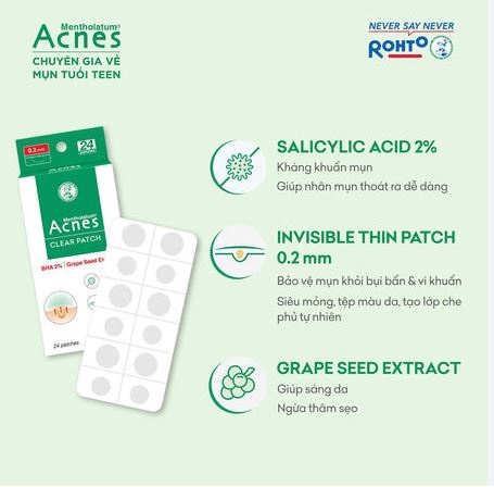Với độ dày chỉ 0,2 mm, miếng dán mụn giúp che phủ tự nhiên, đặc biệt là khi trang điểm cùng với khả năng chống thấm nước và mồ hôi vượt trội. Ngoài ra, chiết xuất nho (Grape Seed Extract) có trong miếng dán mụn giúp ngăn ngừa sẹo thâm sau mụn hiệu quả.