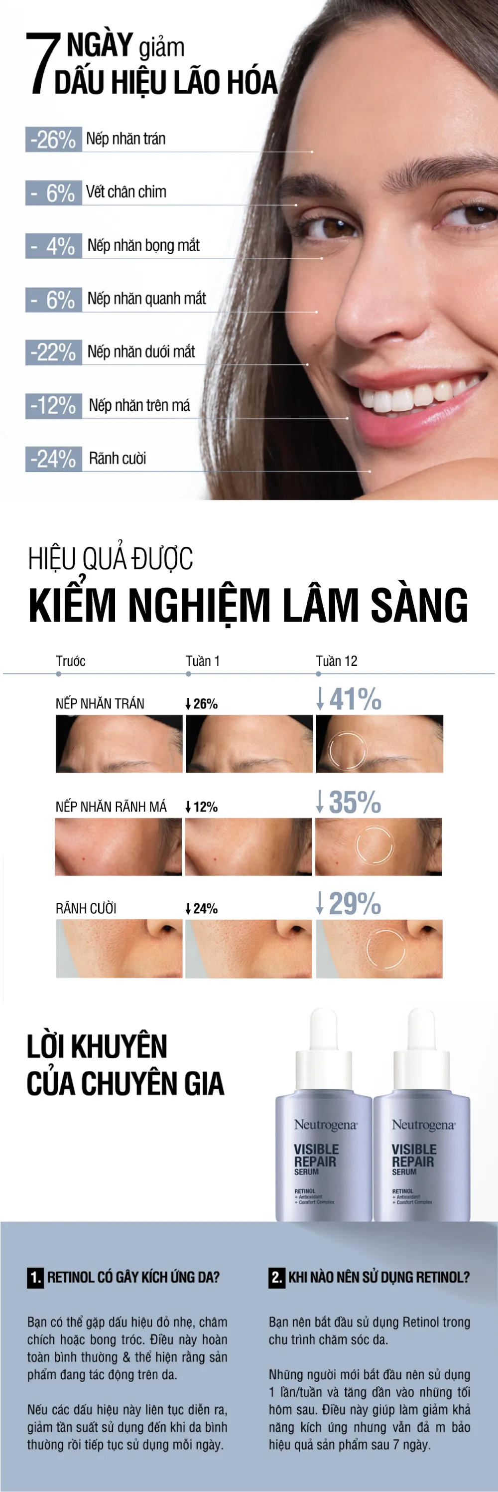 Tinh chất Neutrogena Visible Repair Serum giúp làm giảm các dấu hiệu lão hóa và cải thiện độ sáng mịn của làn da. Với thành phần chính là retinol và vitamin C đem lại chức năng sửa chữa kết cấu da, làm mịn các nếp nhăn và phục hồi độ ăn chắc. Hơn thế nữa, serum retinol còn giúp da đều màu hơn, làm giảm các dấu hiệu chớm lão hóa đang diễn ra trên da.