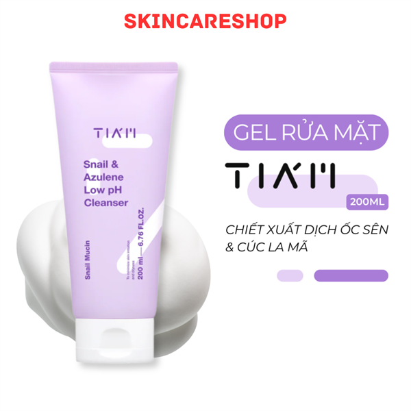 Sữa Rửa Mặt Tia'm Snail & Azulene Low PH Cleanser với chiết xuất từ ốc sên & hoa cúc làm sạch sâu nhưng vẫn giữ được sự ẩm mịn và pH đạt chuẩn 5 tương tự với pH trên da.