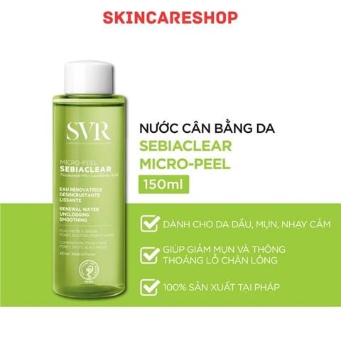 Nước Cân Bằng Da SVR Sebiaclear Micro Peel là sản phẩm toner làm sạch mới đến từ thương hiệu dược mỹ phẩm SVR, được thiết kế chuyên biệt dành cho làn da dầu, mụn. Công thức được bào chế với 90% thành phần tự nhiên và các thành phần hoạt tính nồng độ cao, giúp chăm sóc và cải thiện các khuyết điểm, làm sạch da và thông thoáng lỗ chân lông, ngăn ngừa và làm giảm mụn. Kết quả mang lại một làn da sạch thoáng, mịn màng và tươi sáng hơn.