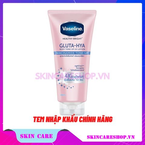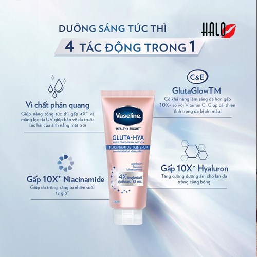 Sữa Dưỡng Thể Vaseline Healthy Bright Gluta-Hya Nâng Tông Tức Thì 300ml với công nghệ Gluta Glow, có tác dụng mạnh hơn gấp 10 lần so với Vitamin C. Sản phẩm nâng tông da nhanh chóng, cải thiện da xỉn màu, thúc đẩy sản sinh collagen và phục hồi độ ẩm từ sâu bên trong.