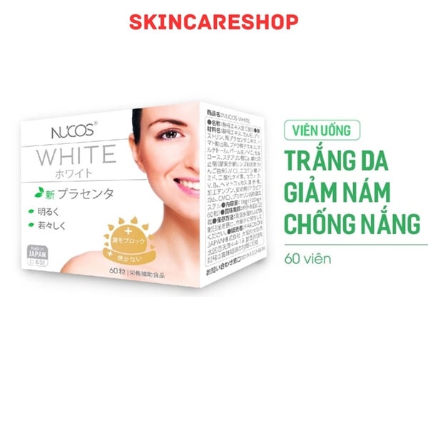 Viên Uống Trắng Da Mờ Thâm Nám Nucos White 60 Viên/Hộp với công nghệ tiến tiến từ Nhật Bản giúp bảo vệ da, hỗ trợ giúp giảm nám, tàn nhang, làm sáng và đều màu da. Đồng thời sản phẩm với thành phần thiên nhiên giàu dưỡng chất giúp nuôi dưỡng da, giúp bảo vệ da khỏe mạnh, đàn hồi và sáng mịn và hỗ trợ chống nắng nội sinh hiệu quả.